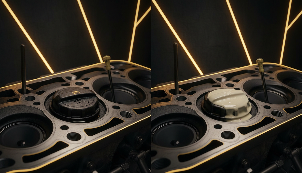 По сути этот налет — водно-масляная эмульсия, смесь моторного масла и влаги. Выглядит как светло-бежевый, молочный или кремовый осадок с маслянистым блеском. Чаще всего он скапливается именно на крышке и стенках горловины, потому что это одни из самых холодных точек в верхней части двигателя.