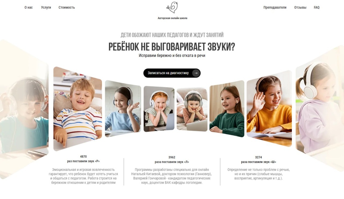 Огромное количество отличий школы от всех других предложений по коррекции речи, которые в совокупности обеспечивают высочайшую результативность. Было непросто все это стрктурированно показать, чтобы подвести к ответу на ключевой вопрос "Почему нужно выбрать именно эту школу?" Сайт строили по схеме центральной связующей страницы, к которой подключаются продающие лендинги по каждому направлению школы. Сейчас запустили главную страницу и первый лендинг "Коррекция звуков". Сегодня запустили рекламу.
