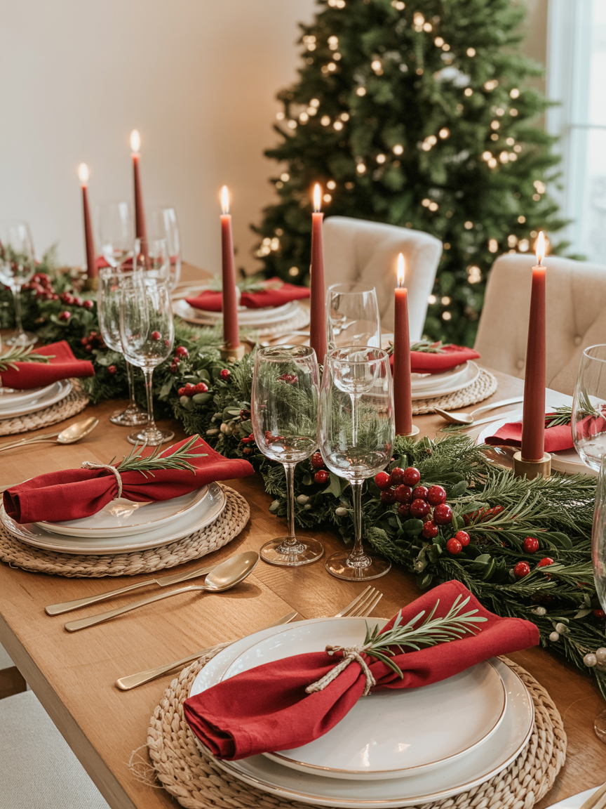 От мерцающих металлических оттенков до уютных клетчатых узоров, продуманная сервировка стола превращает обычный обед в праздничное событие, которое кажется по-настоящему особенным. В этой статье собраны элегантные и вдохновляющие идеи оформления новогоднего стола, которые добавят блеска, тепла и индивидуальности вашим праздничным застольям. Бархатные зеленые салфетки, тарелки с золотой каймой и элегантные золотые столовые приборы придают каждой сервировке роскошный праздничный шарм. Гирлянды и свечи дополняют уютную, сияющую новогоднюю атмосферу за столом. Современная и изысканная сервировка стола сочетает в себе золотые подставки под тарелки, белоснежные тарелки и хромированные акценты, создавая утонченную праздничную атмосферу. Цилиндрические свечи и матовые украшения добавляют мягкое, роскошное сияние. Сверкающие золотые у