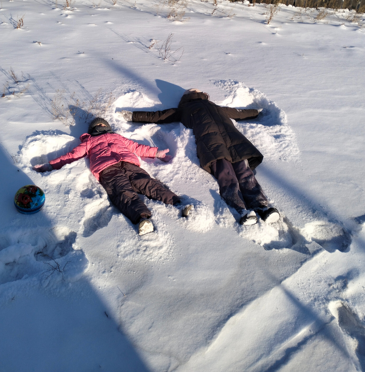 Поиграли в мяч с Мариной и поделали снежных ангелов.
