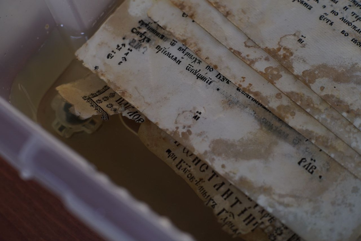 Я билась над ней больше года, и опускались руки не раз от того, что ничего не получалось. Главной бедой была плесень. Она была везде: и на страницах, и на кожаной обложке. Я её и мыла, и химией обрабатывала, а она не сдавалась и появлялась снова и даже перекинулась на другие вещи в мастерской. Из-за неё бумага сильно пострадала. В некоторых местах осыпи, а в других страницы склеились в одну массу. Но я их всё-таки разделила. Каждый листочек промыла, обработала, выдержала в специальной камере, заклеила все дырки и аккуратно сшила. И тут новая проблема! Оказалось, что старая кожаная обложка со временем усохла и стала мала для книжного блока. Пришлось подрезать страницы и менять картон внутри переплёта. Но в итоге получилось! Из того, что было похоже на груду рассыпающегося мусора, теперь снова книга. Её можно спокойно взять в руки, листать и читать. Это стоило того.