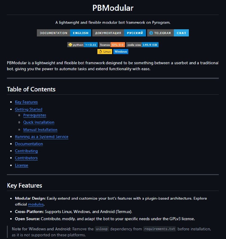 π€ PBModular β ΡΡΠΎ Π»Π΅Π³ΠΊΠΎΠ²Π΅ΡΠ½ΡΠΉ ΠΈ Π³ΠΈΠ±ΠΊΠΈΠΉ ΠΌΠΎΠ΄ΡΠ»ΡΠ½ΡΠΉ ΡΡΠ΅ΠΉΠΌΠ²ΠΎΡΠΊ Π΄Π»Ρ ΡΠΎΠ·Π΄Π°Π½ΠΈΡ Telegram-Π±ΠΎΡΠΎΠ² Π½Π° Python Ρ ΠΈΡΠΏΠΎΠ»ΡΠ·ΠΎΠ²Π°Π½ΠΈΠ΅ΠΌ Π±ΠΈΠ±Π»ΠΈΠΎΡΠ΅ΠΊΠΈ Pyrogram