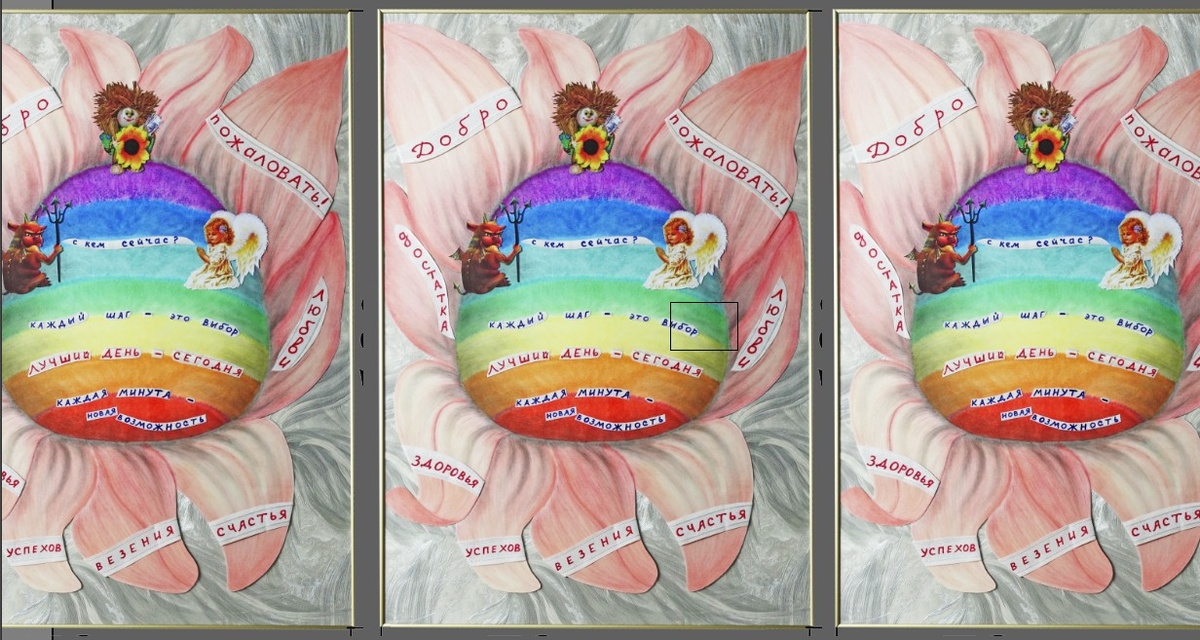 Сначала находим в магазине или в интернете рамку для будущей картины. После этого, определившись с размерами, можно приступать к работе. Прикрепляем удобным для себя образом лист, на котором будем рисовать. Затем набрасываем простым карандашом эскиз. Я люблю фон создавать пастелью. В моём случае можно заезжать за края, нанося цвет сухой и/или масляной пастелью, т.к. потом я буду вырезать лепестки. Между объектами (это между яйцом и лепестками цветка) оставлю промежуток. Белое пространство необходимо, во-первых, для объема, который создам позже с помощью теней, во-вторых, чтобы при нанесении лака цвета не смешались. Обрабатываем специальным лаком для пастели: Теперь можно нанести тень для придания объема 3-Д и еще раз обрабатываем лаком для пастели: Сверху наклеиваем в виде аппликаций чёртика, ангелочка и сверху – домового: Потом все вместе обрабатываем лаком для яхт. Это чтобы исключить выгорание красок при попадании солнечных лучей: Затем вырезаем фон.
