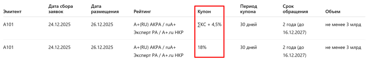 🧐 В текущих экономических условиях нужно максимально аккуратно подходить к выбору эмитентов облигаций. Не секрет, что на фоне затяжного цикла жесткой денежно-кредитной политики и как следствие - высокой ключевой ставки, некоторые компании начали испытывать трудности с обслуживанием своих обязательств. ⚖️ В последние несколько месяцев кредитные рейтинговые агентства стали отзывать или снижать рейтинги ряда эмитентов, в основном из сегмента ВДО. И здесь важно отметить, что в ноябре и у ГК «А101» кредитный рейтинг тоже изменился, но в лучшую сторону. 📈 В середине ноября «Эксперт РА» повысило рейтинг кредитоспособности ГК «А101» до уровня "ruA+" со стабильным прогнозом, а парой дней ранее АКРА также повысило кредитный рейтинг до уровня А+(RU) с прогнозом «стабильный». Поэтому, здесь риски даже технического дефолта практически отсутствуют. 📝 Давайте более подробно разберем, какие условия по новым облигациям предлагает нам эмитент. 🇷🇺 Параметры выпуска БО-001P-02 ➖ Объем размещения: не