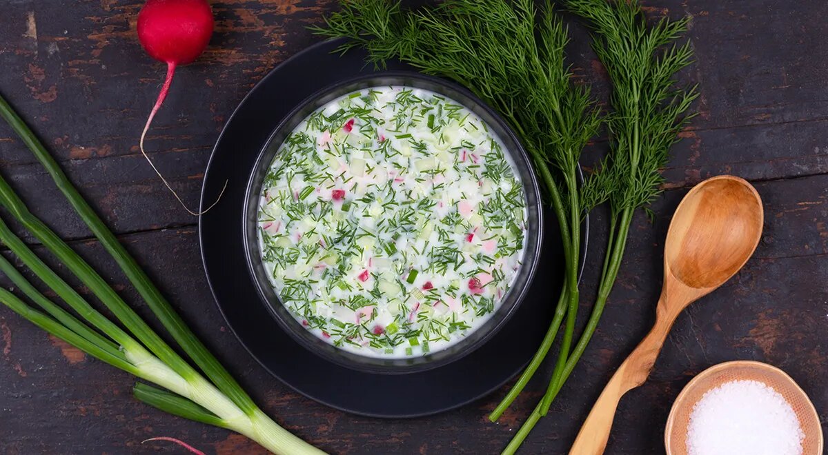 Процедура та же самая, только заливаем всё это дело уже кисломолочным продуктом. Отличный выбор для лёгких летних вечеров! Иногда хочется встряхнуться и добавить блюду немного экзотики. Эта версия придаст свежей нотки благодаря редису и лёг