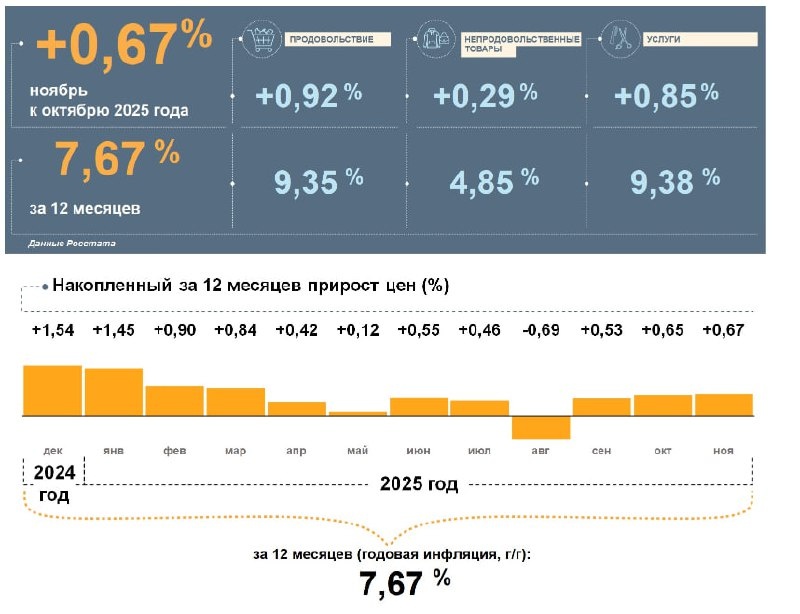 По итогам ноября инфляция в Удмуртии замедлилась с 8,63% до 7,67%, сообщает пресс-служба удмуртского отделения Банка России. При этом средний уровень инфляции в стране – 6,64%. Цены в республике в ноябре выросли на 0,67% по сравнению с октябрем. За месяц значительно подорожали продукты питания и услуги. Цены на непродовольственные товары выросли умеренно. Сильнее всего выросла стоимость перцев, огурцов, помидоров. Также отмечается рост цен на куриные яйца. «С сентября по ноябрь птицефабрики перекладывали в цены накопленный рост издержек, в том числе на зарплаты сотрудников, ветеринарные препараты, корма и упаковку. При этом за год цены на яйца снизились на 20,69%. С февраля по август 2025 года яйца дешевели, что было связано с ростом их производства в целом по стране», – отмечают в регуляторе. Из услуг значительнее всего подорожал отдых в новогодние праздники в санаториях и пансионатах. Фото: удмуртское отделение ЦБ ФР Подписывайся на Ижевский бизON #Удмуртия