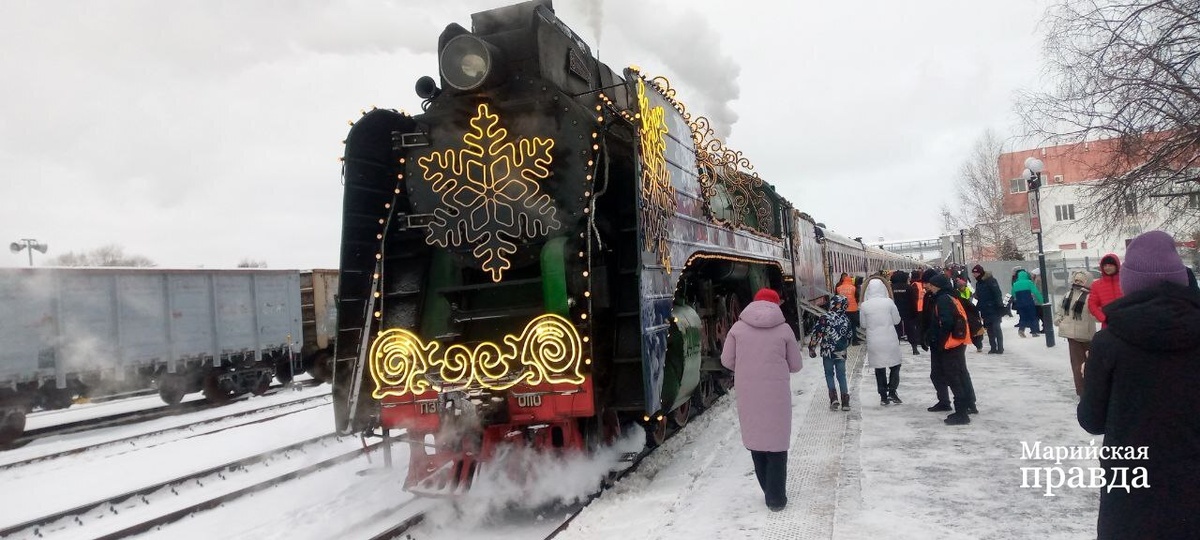 Сегодня, 23 декабря, столицу Марий Эл посетил новогодний поезд Деда Мороза. Ровно в 10:30 праздничный локомотив остановился на перроне железнодорожного вокзала Йошкар-Олы. Надо заметить, что народу на перроне было – яблоку негде упасть. Праздничную программу вели персонажи сказочной свиты Деда Мороза – Гном, Снеговик и братья-зайки. Они отметили, что в Йошкар-Оле живут самые гостеприимные люди. Дед Мороз и Снегурочка поздравили детей с наступающим новым годом. А зимний волшебник поделился секретом, как загадывать желание – оно должно быть искренним и идти от сердца, и тогда обязательно сбудется. С помощью своей сказочной свиты Дед Мороз собрал желания детей в свой сундук. На перроне среди встречающих был и заместитель министра культуры, печати и по делам национальностей Александр Луничкин. Он отметил, что новогодний поезд привез в регион первые зимние морозы и праздничное настроение.