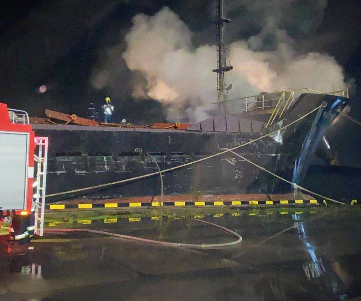 На кадрах сгоревшее после удара «Герани» судно в Одесском порту