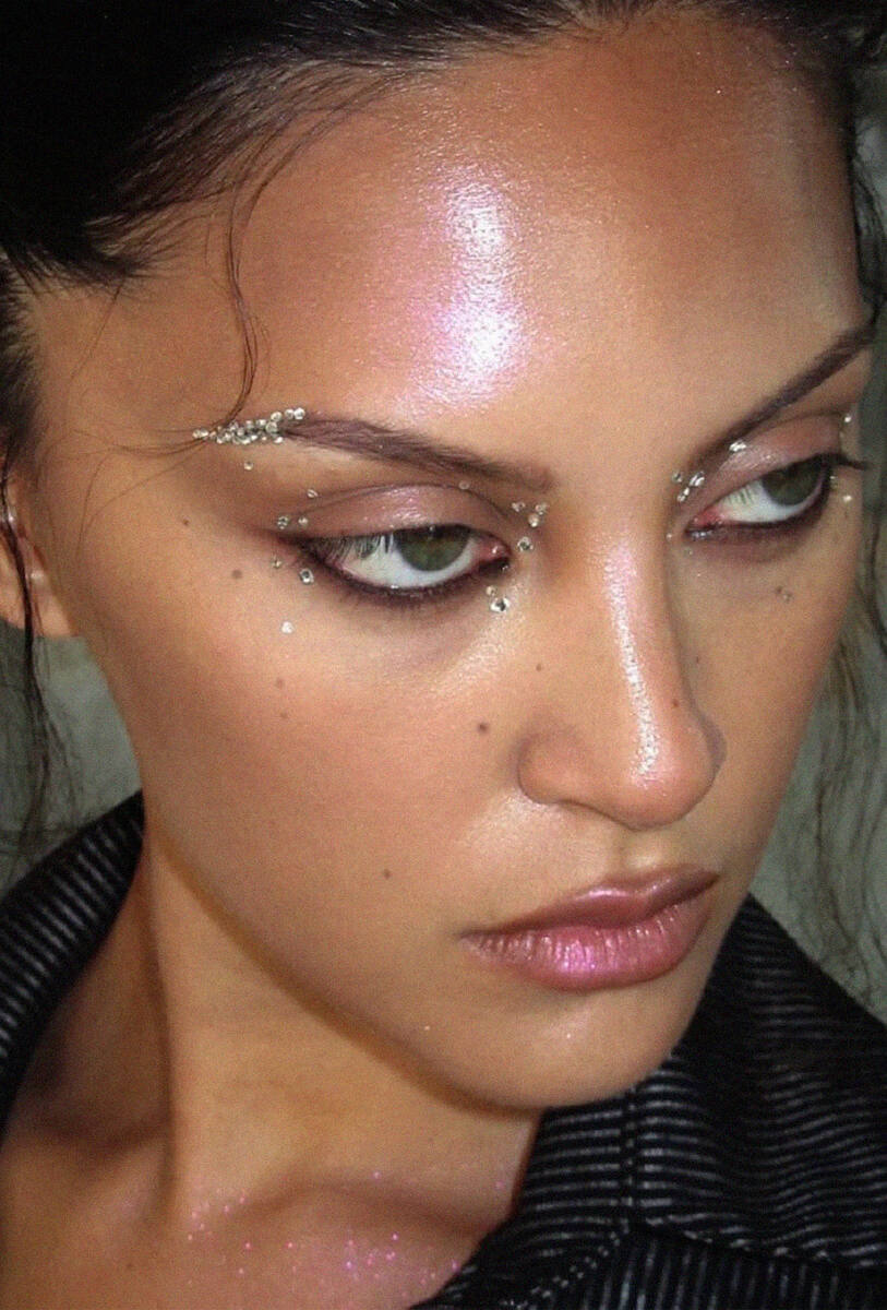 Повторим завирусившийся макияж визажистки Бьянки Браун с розовым хайлайтером и стразами на бровях.