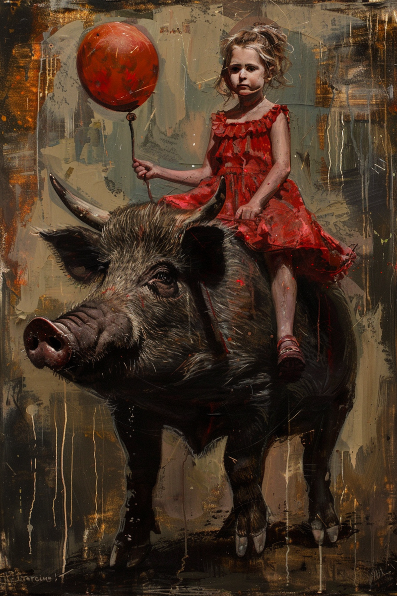 Мне хотелось сыграть на контрасте наивности и угрозы: маленькая девочка в ярком платье верхом на тяжёлом, зловещем кабане создает одновременно смешной и слегка пугающий образ. Акцент на красном и грубая фактура щетины придают картине сатирический, кинематографичный характер. Промпт и результат генерации публикую для вас.