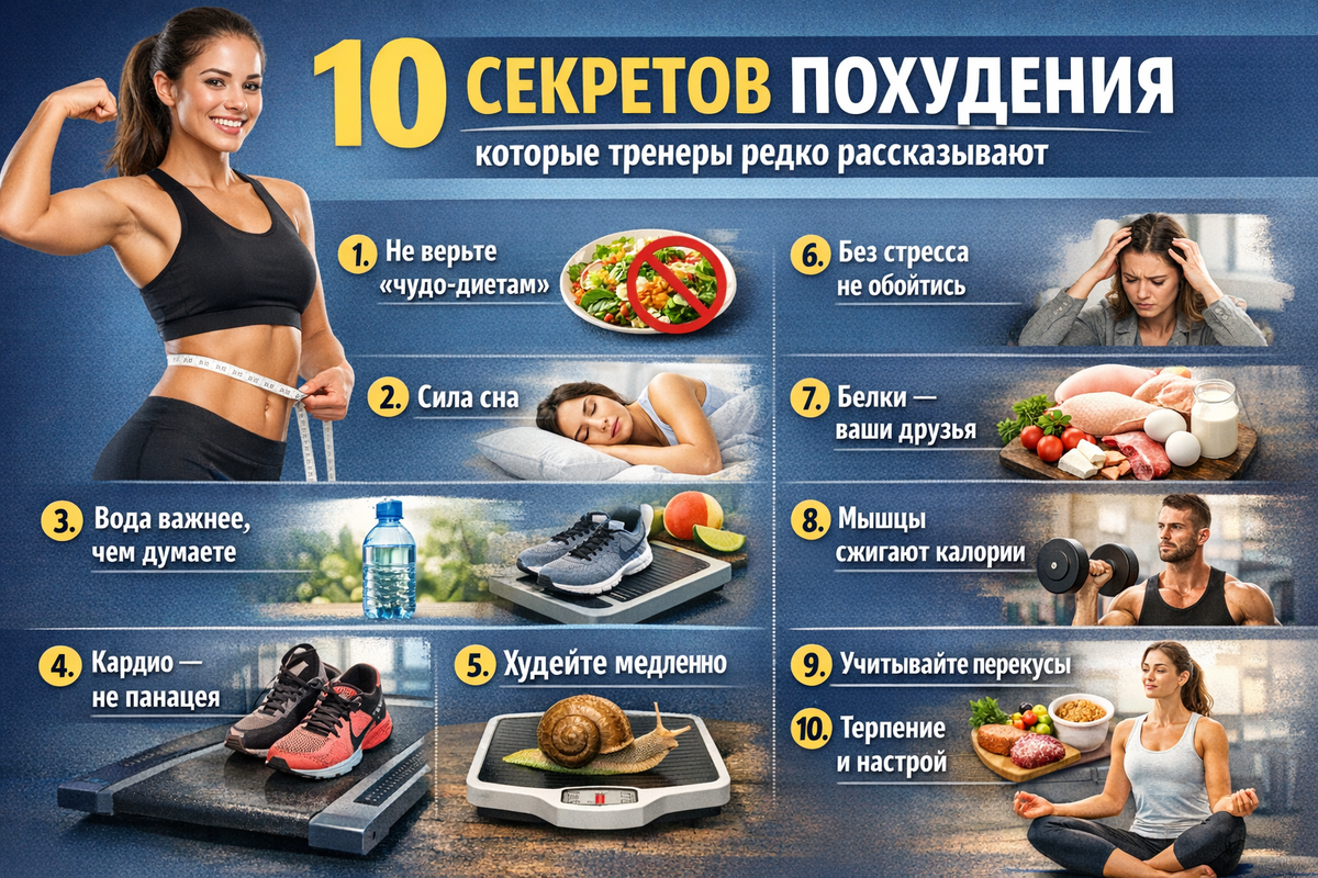 Привет, друзья! Если вы здесь, значит, вы устали от бесконечных диет, обещаний “минус 10 кг за неделю” и разочарований от отсутствия результата. Многие фитнес-тренеры в зале или онлайн фокусируются на очевидном: “Ешь меньше, двигайся больше”. Но есть нюансы, которые они часто не раскрывают — либо потому, что клиенты хотят быстрых решений, либо потому, что эти секреты требуют дисциплины и понимания тела. Сегодня я поделюсь 10 малоизвестными секретами похудения, основанными на опыте профессиональных тренеров и научных данных. Эти советы помогут вам худеть эффективно и надолго, без срывов и йо-йо эффекта.