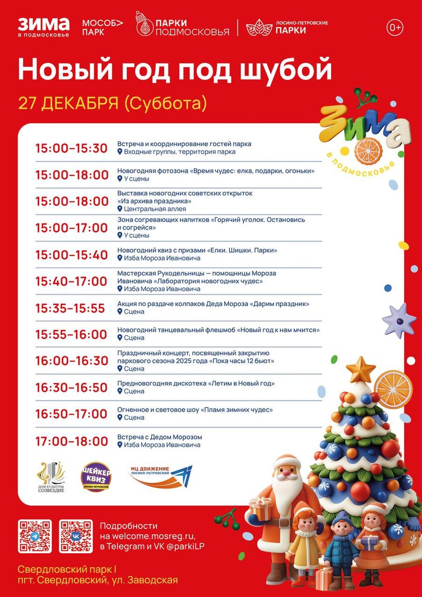 🎄 В ближайшие выходные парки округа превратятся в центры семейного отдыха, творчества и зимнего волшебства. Программа насыщена событиями для гостей всех возрастов — от творческих мастерских и интеллектуальных викторин до спортивных активностей и встреч с главными героями зимы. 🗓 27 декабря (суббота) гостей ждет праздник «Новый год под шубой» — с концертной программой, танцевальным флешмобом и предновогодней дискотекой. В парке будут работать новогодняя фотозона, выставка открыток и зона согревающих напитков. В программе также квиз с призами, творческая мастерская, огненно-световое шоу и встреча с Дедом Морозом. 🗓 28 декабря (воскресенье) программа продолжится. С 14:30 на универсальной площадке пройдет дыхательная гимнастика «Зимнее дыхание». В Избе Мороза Ивановича с 15:00 состоится встреча с Морозом Ивановичем, а с 16:00 — «Мастерская Снеговиков». 🗓 В этот же день основные события запланированы и в другом парке округа. Праздник начнется в 15:30 со спортивной программы в зоне у