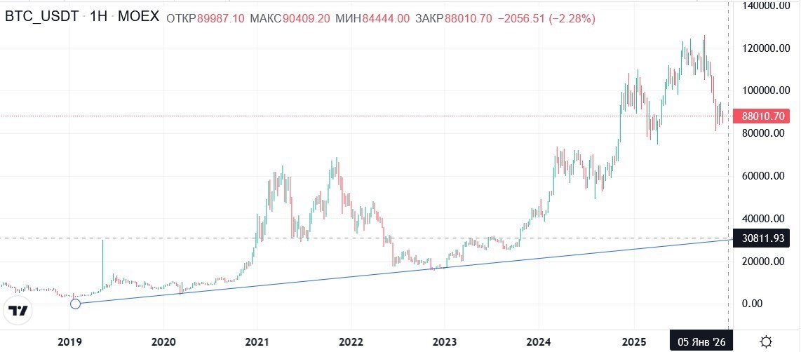 ) Обещанное продолжение: Мы рассматриваем тот же график, только на более длинном временном отрезке в 7 лет. Что за леший? Куда подевалась наша поддержка в 80? Новая поддержка 30?! Э не, так я не согласен... На этом примере показываю вам границы технического анализа. Если бы он надёжно работал, то обезьяны бы могли чертить и инвестировать. 80 действительно по технике надёжнее чем было 100. И от 100 падение до следующей поддержки в 30 болезненнее чем от 80)) Вас не очень воодушевляют подобные выводы технического анализа? Меня тоже. Поэтому я им реже пользуюсь, а в основном управляю рисками на базе долей в портфеле. Если биток вырос до 120, часть продать. Съехал до 80 - недостающую часть снова купить. В моём случае целевая аллокация была сформирована уже несколько лет назад и поэтому я ещё долго ничего не буду покупать. Но у каждого индивидуальные целевые доли и следовательно разные моменты покупок/продаж! Не инвестиционная рекомендация. Ваши деньги - Ваше дело!