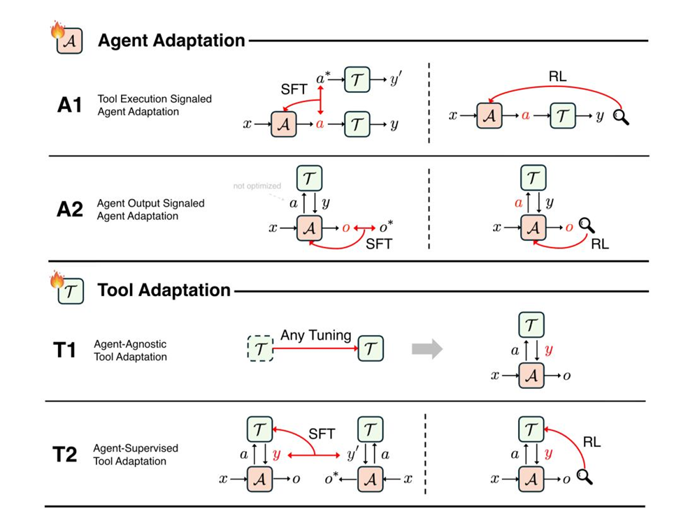 Идеальный сценарий — когда и агент, и инструменты одновременно подстраиваются друг под друга в одном цикле обучения. Но это рождает проблему кредитного распределения: если задача провалена, кто виноват — ядро‑агент, поисковый модуль или, скажем, планировщик? Без решения этой задачи сложно строить устойчивые системы. - Непрерывная адаптация (Continual Adaptation)