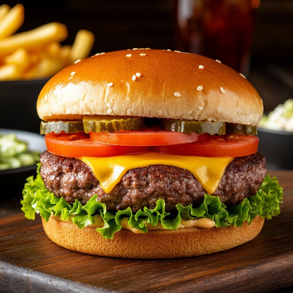Собираем бургер: Булочки разрезаем пополам и слегка поджариваем на сухой сковороде или в тостере. Нижнюю половинку смазываем соусом, кладем лист салата, затем – помидоры, огурцы, лук, сверху – котлету с сыром, еще раз соус и накрываем верхней булочкой.