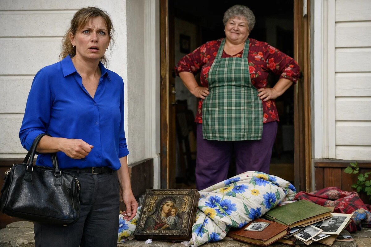 Марина вернулась с работы в половине седьмого. Калитка открыта настежь. В доме горит свет, из кухни — грохот. На крыльце валяются её занавески с васильками, бабушкин образ-- икона с треснутым стеклом, семейные альбомы с пожелтевшими фотографиями.