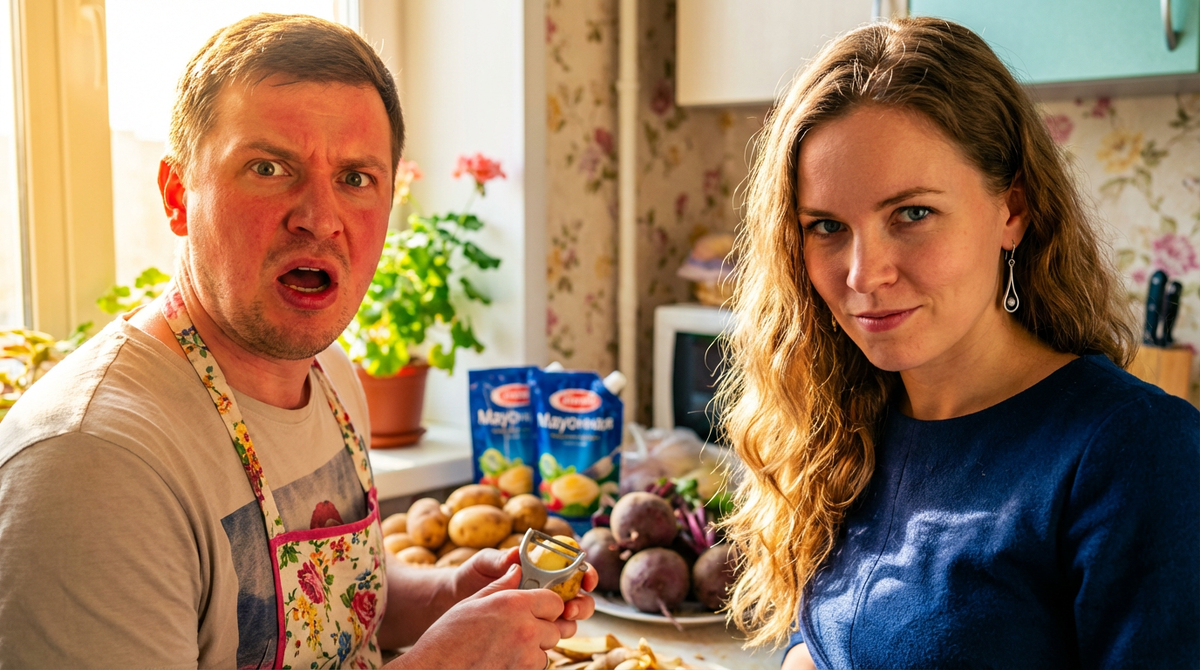 Вадим стоял красный как рак. Он понимал, что проиграл. Проиграл в тот момент, когда попытался сам почистить пять килограммов картошки и порезался на второй же штуке. Когда понял, что свеклу варить надо час, а не пять минут. Когда майонез предательски брызнул на его новую рубашку, а мясо начало гореть снаружи, оставаясь сырым внутри.