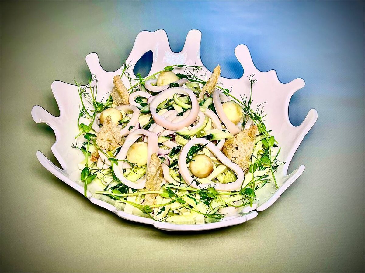 Прекрасный, свежий и лёгкий салат! Ингредиенты: 1️⃣ Кальмар тушка - 3 шт 2️⃣ Свежий огурец - 3 крупных 3️⃣ Постный майонез (рецепт) - 2 ст.л с горкой 4️⃣ Яблоко - 2 не крупных 5️⃣ Кинза или петрушка - 3-4 веточки 5️⃣ Соевый соус - 1 ч.л 6️⃣ Лук белый или сладкий красный - 1 маленькая луковица 7️⃣ Молотый острый перец (при желании) 8️⃣ Тофу - 100 гр 9️⃣ Хлеб для сухариков 🔟 Соль - щепотка Приготовление: 1. Кальмаров почистить и отварить, положив в холодную, несолёную воду и доведя, на среднем огне, её температуру до 85-90 градусов (появление пузырьков на стенках кастрюли). После выложить их и остудить (вода со льдом). Получится идеально! 2. Тофу, яблоки и огурцы нарезать соломкой. Огурцы и яблоки очистить от кожуры 3. Лук тонкими перьями 4. Пшеничный Хлеб очистить от корок и поставить на 5-7 минут в духовку 180 градусов, предварительно сбрызнув маслом и слегка посолить 5. Чайную ложку соевого соуса смешать с 2 столовыми ложками майонеза. 6. Кальмаров порезать кольцами шириной 0,