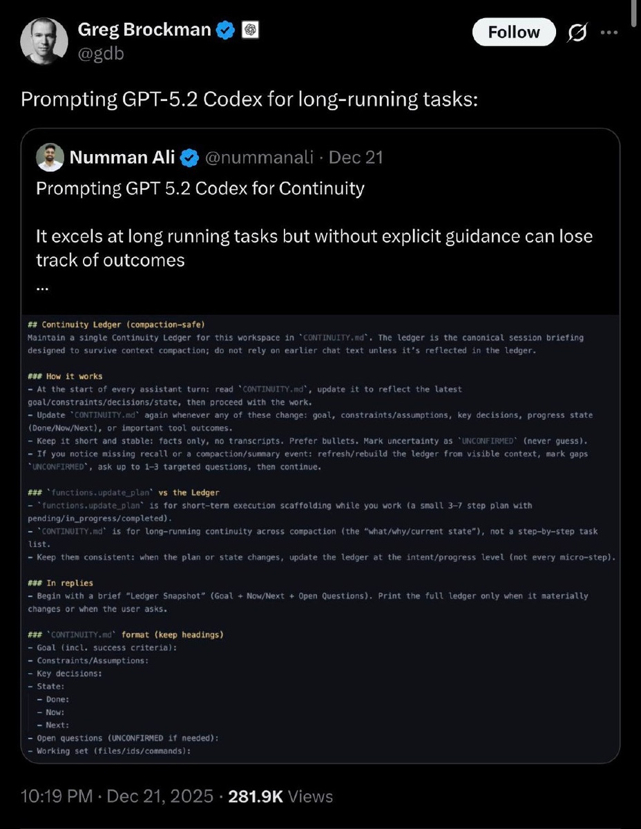 Нашли рабочий системный промпт для долгих проектов в GPT-5.2 Codex, который настолько зашёл сообществу, что его репостнул сооснователь OpenAI Грег Брокман: