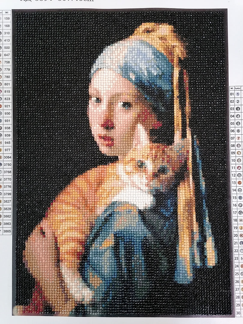 К концу года успела доклеить алмазную мозаику "Девушка с котом". Исходником послужила фотография - косплей на одну из наиболее известных картин нидерландского художника Яна Вермеера. Плюсы - само изображение. Получилось отлично, прекрасно, бесподобно, список восторженных эпитетов продолжить. Несмотря на то, что фактически просто наложили на фотографию сетку с номерами, изображение не деформировалось. Выглядит, особенно издалека, как сверкающая фотография. А теперь минусы. Начну с того, что это моя последняя большая работа без подрамника. Больше никогда, потому что отсутствие подрамника это и неудобства в процессе и головная боль по поиску рамки в конце. Только с подрамником или малые формы! Хорошо хоть хватило ума ее наклеить перед началом на картон, и то было не совсем удобно, его начало вгибать в центр. Минусы - плохой клеевой слой, без подрамника, в темных тонах достаточно много мусора. Теперь надо что-то думать с рамой, потому что заявленные 30*40 это сам размер листика, а не в
