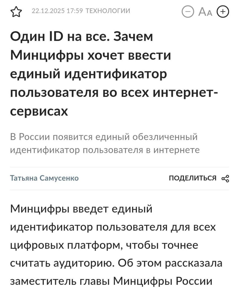 Минцифры предлагает связать все аккаунты одного человека, включая фейковые. Официально — для подсчёта реальной аудитории сайтов. Ведомство обещает передавать данные обезличенно, но полная информация о действиях в сети будет храниться у государства 👉🏻Новости №1 в Ростове 💌Прислать новость/фото Ростов Папа теперь в Ⓜ️🅰️❌