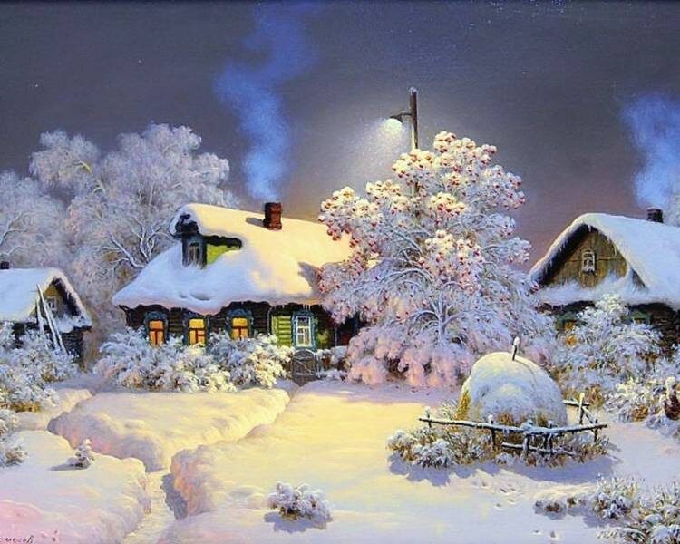 Зима в деревне это особый мир, который живёт по своим законам света и цвета. Когда солнце заходит, белый снег перестаёт быть просто белым. Он вбирает в себя синеву неба, золото света из окон и серебро лунных лучей. Этот контраст между пронзительным холодом снаружи и теплом, идущим от деревянных изб, веками вдохновлял живописцев.