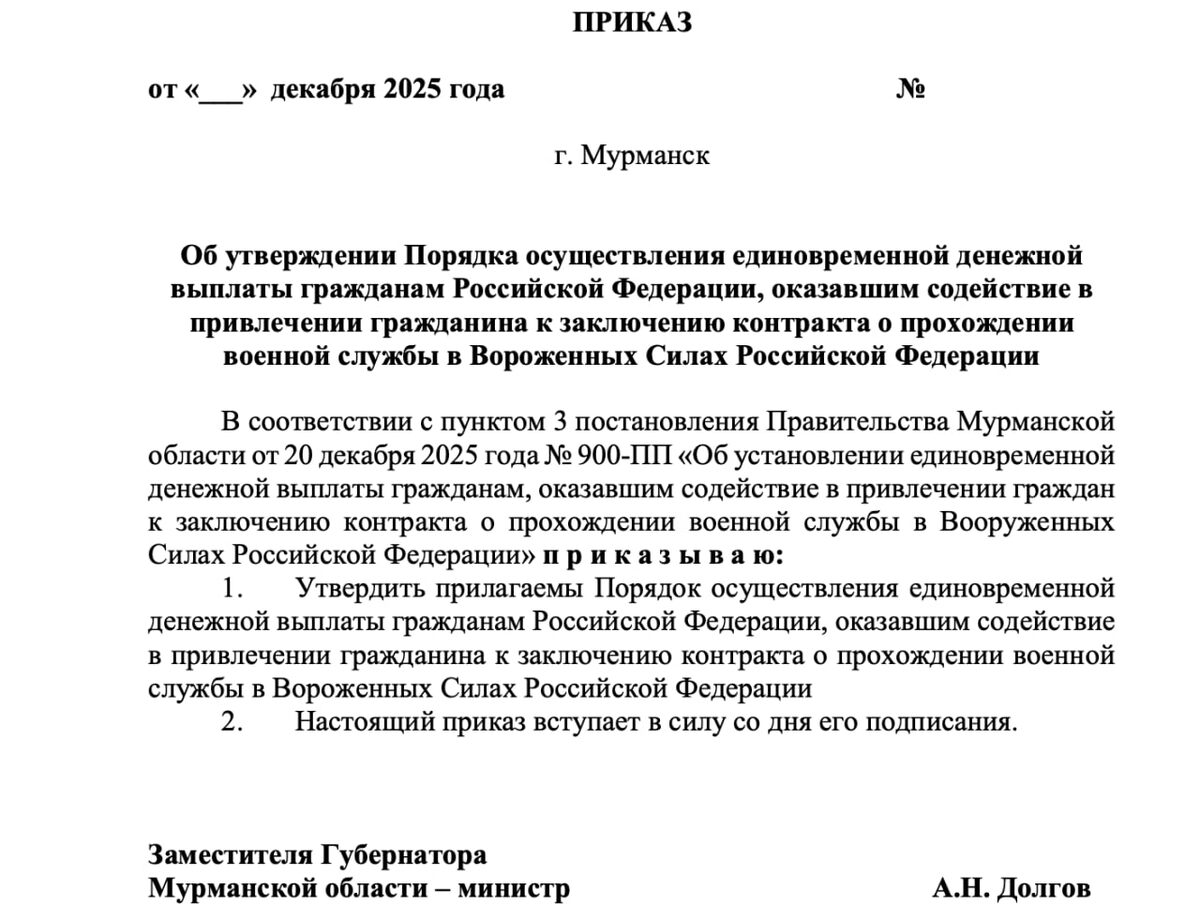 В Мурманской области планируют выплачивать гонорар за каждого завербованного на контракт с Минобороны гражданина.
