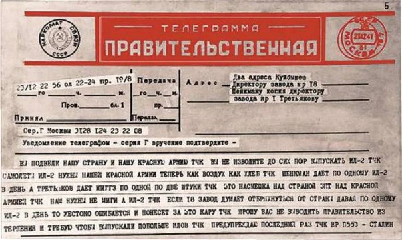 в адрес директоров двух авиационных заводов - московского №1 и воронежского №18 Анатолию Третьякову и Матвею Шенкману. На тот момент оба этих завода были эвакуированы в Куйбышев (так тогда называлась Самара). «Вы подвели нашу страну и Красную Армию. Вы не изволите до сих пор выпускать ИЛ-2. Самолеты ИЛ-2 нужны нашей Красной Армии теперь как воздух, как хлеб. Шенкман дает по одному ИЛ-2 в день, а Третьяков дает МИГГ-3 по одной по две штуки. Это насмешка над страной, над Красной Армией. Нам нужны не МИГи, а ИЛ-2. Если 18 завод думает отбрЯхнуться от страны, давая по одному ИЛ-2 в день, то жестоко ошибается и понесет за это кару. Прошу вас не выводить правительство из терпения и требую, чтобы выпускали побольше ИЛОВ. Предупреждаю последний раз. СТАЛИН.»