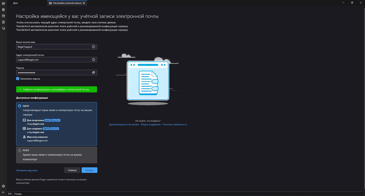 Для того, чтобы настроить почту: Далее используйте следующие данные: Подробнее о настройке Mozilla Thunderbird Если возникнут вопросы, напишите нам, пожалуйста, тикет из панели управления аккаунта (раздел “Помощь и поддержка”), а если вы захотите обсудить эту статью или наши продукты с коллегами по цеху и сотрудниками Бегета – ждем вас в нашем сообществе в Telegram.