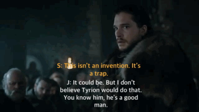 Таким образом, он отклоняет просьбу Серсеи остаться вне войны и публично встает на сторону Дейенерис. Ему необходимо ее полное доверие, и он очень умело разыгрывает образ северного шута. Он «преклонил» колени втайне, без ведома ее советников. И Тирион в этой фразе делает хороший намек на будущее.