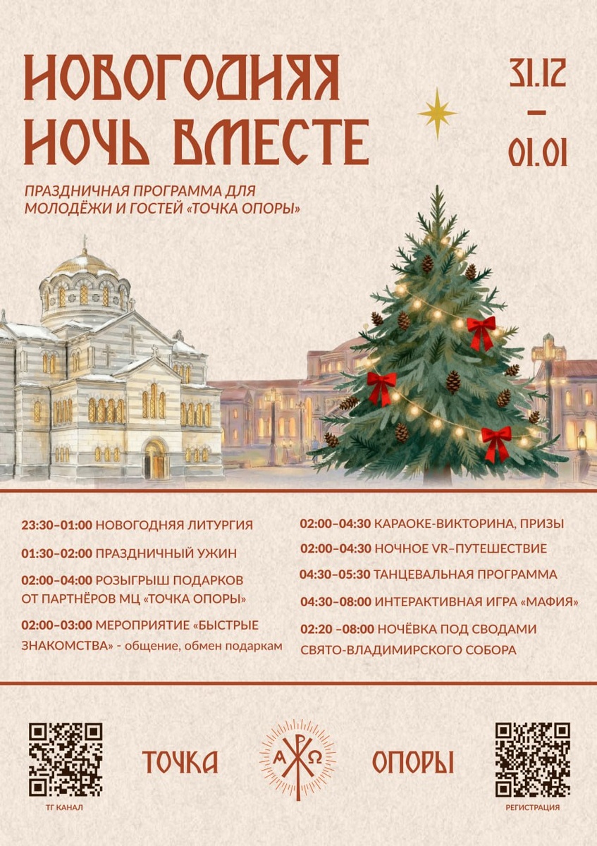 Хотите встретить Новый год не «как обычно»? Приходите в «Точку Опоры». ♥️ Ночная литургия. ♥️ Праздничный ужин. ♥️ Подарки и розыгрыши. ♥️ Знакомства, игры, караоке и танцы. ♥️ И ночь под сводами Свято-♥️Владимирского собора. ⭐Начало 31 декабря в 23:30. И до самого утра⭐ Если вы ищете тёплую и веселую компанию — вам к нам. Подробная программа на афише. 🖥 Чтобы поучаствовать в мероприятиях необходимо зарегистрироваться - vk.cc/cSGet5 #объявления_севмгу