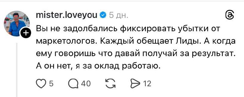 🖐 Увидела недавно сообщение в соцсети — прям крик души от предпринимателя👆. Проблема серьезная 💯. 🙏 Понимаю: платишь немалые деньги, маркетолог что-то там делает, а результата в деньгах нет. 👉 Но можно понять и специалиста по маркетингу. Одна из глобальных целей маркетолога — привести целевой лид, чтобы он купил. 🟤Но если продукт сложный/дорогой/упакован плохо, конкурентов много на рынке, а продажники при этом плохо продают, не умеют работать с лидами — маркетологу будет очень сложно выполнить задачу. Мотивация работать НЕ будет, маркетологи будут сменять друг друга, а предприниматель терять деньги. В таких случаях я всегда рекомендую: 1️⃣ Разобраться системно с бизнес-процессами в компании, проанализировать все отделы на компетентность и только после этого выстраивать систему мотивации. 2️⃣ Если нужно привязать маркетолога к KPI по конечному результату (продажам), рекомендую привязывать KPI к параметру SQL (Sales Qualified Lead) — лиды, которые прошли квалификацию в от