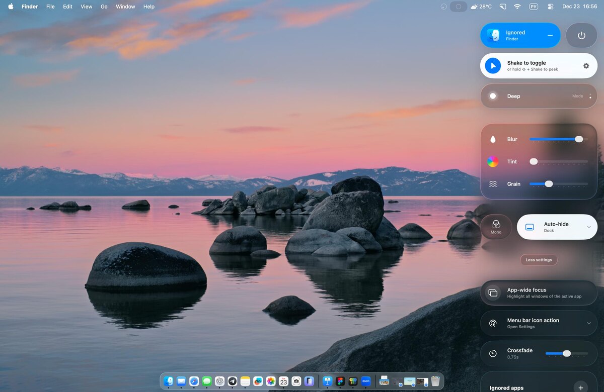 Чем сильнее выделяет его. В дизайне интерфейсов похожий приём часто используют чтоб всплывающие окна и оферы контрастнее выглядели (это уже dark паттерны или ещё нет?) С момента первого включения HazeOver я мечтал, что выйдет апдейт, где вместо затенения будет размытие. Дождался. Но! В другом приложении Monocle Создаёт красивое размытие экрана позади активного окна. Выглядит супер-секси. Вышла третья версия. Есть полное размытие и progressive-blur. Этакий компромис: "давай размоем, но чуть-чуть". Как будто не энтузиаст создавал приложение, а некая корпорация, с семью митингами и восемью созвонами (давайте выберем цвет размытия коллеги) Особый кайф, как создатель приложения перепридумал настройки