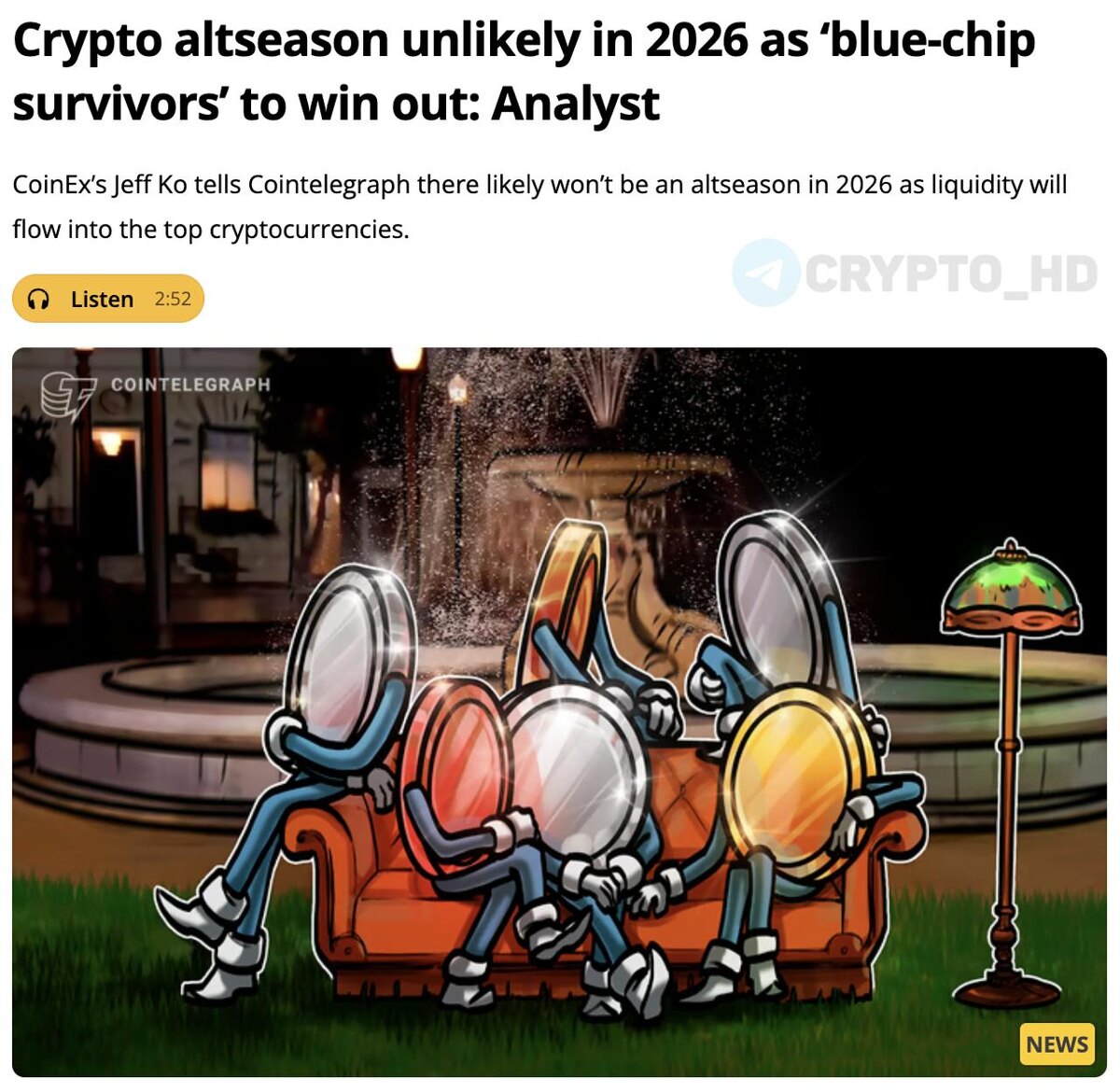 Главный аналитик CoinEx Research Джефф Ко считает, что привычного «альтсезона» рынок больше не увидит. Идея «растет все сразу» больше не работает. Ликвидность станет жестко избирательной и пойдет только в «голубые фишки» крипторынка с реальным применением, а не во весь рынок. Кроме того, аналитик считает, что связь BTC с ростом M2 ослабла после запуска ETF, при этом базовый сценарий CoinEx: BTC вырастет до $180,000 в 2026 году. Crypto Headlines