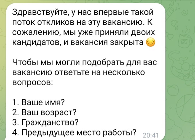 Приветствую вас дорогие подписчики! Вот в поисках подработок вся, если тот год было так что меня звали везде и удалённую работу было не сложно найти то нынче это куда сложнее. А точнее все затихло, начинаешь читать комментарии "трудоголики" отправляют на завод тех кто в их понятии дормоеды. Думаю сами то плохо понимают есть ли вообще сейчас заводы? Хотя одна немного странная блогер пишет что сменила их уже не один значит есть все же ещё у нас заводы. Ну а в нашем Кузбассе уже останавливается все и по факту остались только магазины например "ЦУП- центральный универсам 🍺", системы магазинов продуктовые и общепита. Закрыли последний завод по изготовлению кирпичей, безработные толпами сейчас, что ждёт страшно подумать. Поэтому рада тому что старший хочет в Новосибирске устроится, вполне нормальное желание, в Кемеровской области уже делать нечего от слова совсем. Так вот заморочилась я подработкой, хоть какой уже, паника охватывает что перевели меня на мрот, денег не стало хватать как бы я с собой не договораивалась. Писать через слово номер карты не позволит воспитание, а где ещё взять увы не знаю. А точнее за поиском в интеренет, где и не избежать встречи со "скамом". И вот уже во второй раз получается так что на hh.ru откликаешся, а потом получается не пойми что, переводит он на тг какой то милой девушки, которая ищет сотрудников по всему миру. Отвечает что на эту вакансию уже набрали но просит указать данные для того что бы предложить другую.