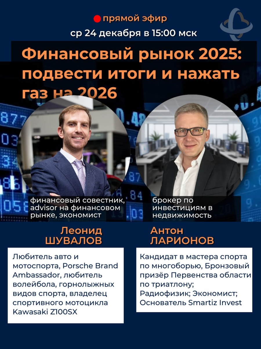 🟧2025 год для финансовых рынков выдался непростым: сочетание повышенной инфляции, высоких ставок и периодических шоков на отдельных сегментах задало сложный фон для частных инвесторов. Аналитики делали ставки на разные классы активов — от консервативных инструментов до более рискованных решений, — и по итогам года стало хорошо видно, где прогнозы оправдались, а где реальность пошла по своему сценарию. Турбулентный рынок не отменяет возможности зарабатывать, но заставляет более аккуратно подходить к выбору инструментов и управлению риском. Даже в условиях колебаний можно получать доходность выше классического банковского депозита, если комбинировать разные классы активов, соблюдать дисциплину и не игнорировать диверсификацию. При этом для многих инвесторов 2025 год стал напоминанием о том, что стратегия важнее краткосрочных прогнозов. 🟧 В ближайшем эфире вместе с Леонидом Шуваловым, финансовым советником из крупной финансовой компании, подведём итоги 2025 года: посмотрим, какие иде