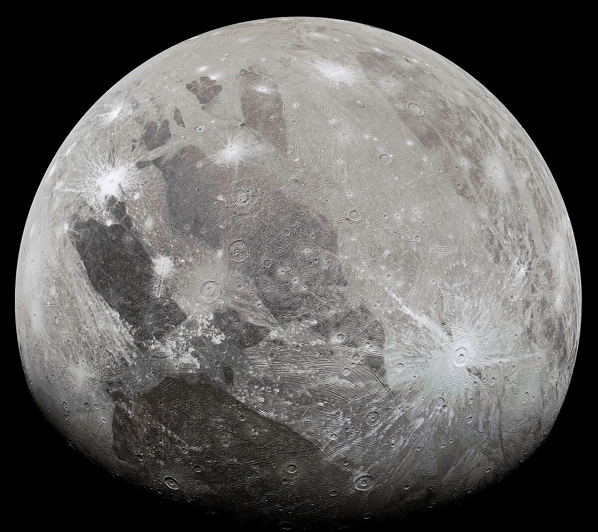 Поверхность Ганимеда состоит из водяного льда. Наблюдаются как более древние, темные и рельефные участки, содержащие глину, так и относительно молодые, светлее. Ледяной спутник полностью покрыт ударными кратерами разных размеров. Возраст некоторых из них доходит до 4 миллиардов лет.