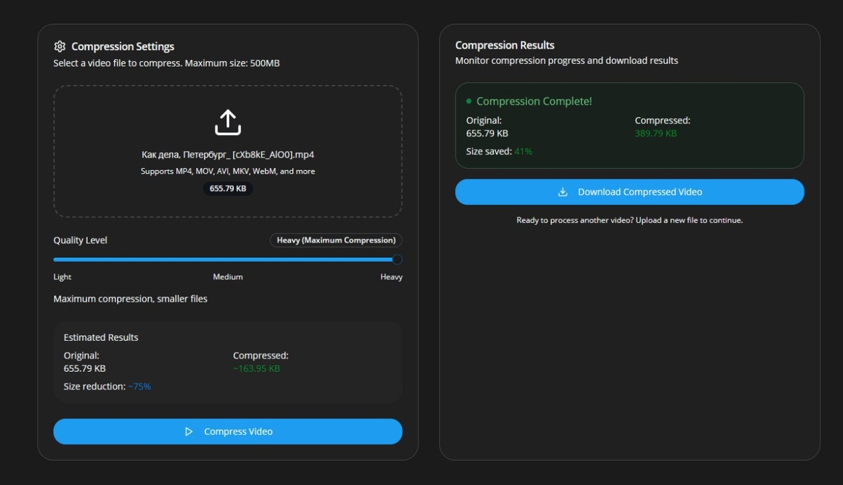 Сжимайте видео прямо в браузере — никаких загрузок на сервер, никаких настроек: просто перетащите файл и получите результат. — Поддерживает все популярные форматы: MP4, MOV, AVI, MKV, WebM и многие другие. — Качество остаётся на высоте даже при сильном сжатии благодаря умным алгоритмам H.264. — Полностью бесплатен, не требует регистрации и работает даже без интернета после загрузки страницы. Идеально для соцсетей, почты или освобождения места на устройстве — забирайте здесь #видео #сжатие #инструменты