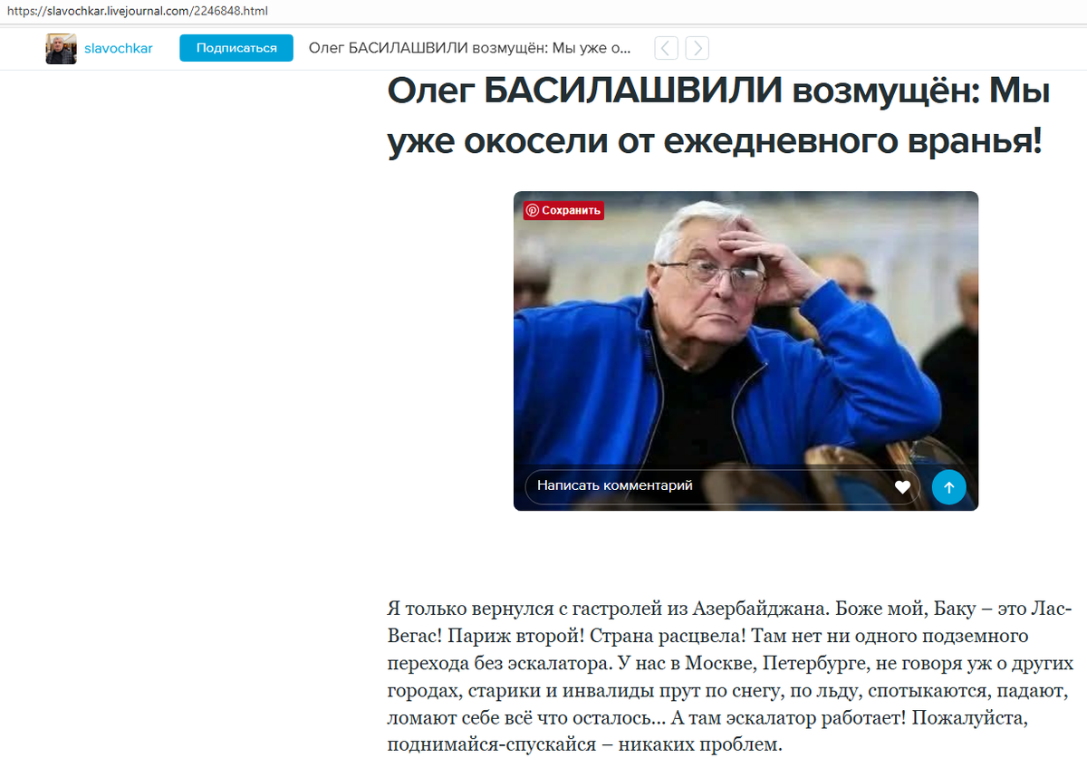 В общем скрин лучше тысячи слов. Не знаю уж писал ли это Олег Басилашвили, оставлю на совести автора, чей журнал я заскринил. Там гораздо интереснее дискуссия в коментах. Ну как всегда. Но вот само событие. Это надо осознать. Чтобы понять как у нас в интернетах деградировали критическое мышление, логики и здравый смысл. Человек побывал в Баку, покатался на эскалаторах уличных и возмущен до глубины души тем, что в Москве таких эскалаторов уличных нет, и старательно давит на эмоции что, мол, пенсионеры ходют по льду и снегу и ужасно страдают. Ну и народ, конечно, ставит лайки, плюсики, поддерживает и тоже возмущен. Как же так, мол, почему же в Баку уличные эскалаторы есть, а в Москве их нет, почему в Москве пенсионеры вынуждены по снегу и льду превозмогать вместо того, чтобы как в Баку на эскалаторах. А ведь тут уместно возмутиться еще и тем, почему на улицах Москвы не растут пальмы. В Баку же растут. Ну то есть в Москве нет кое-чего, чего есть в Баку. Уличных эскалаторов, свободнораст