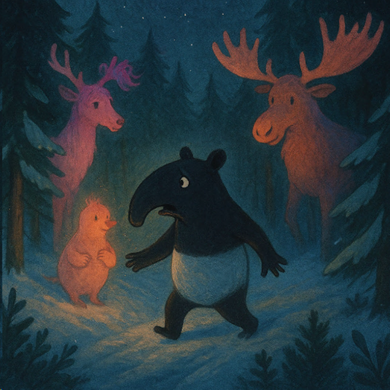 Зима уже давно захватила лес, на полянах скрипел снег, звери готовили гирлянды из шишек и сушёных ягод, а по ночам виднелись огоньки костров — кто-то репетировал хороводы. Все готовились к празднику. Все — кроме Тапира. — Праздники, — ворчал он, копаясь в старом термосе с чаем. — Лишь суета да расточительство. Какие гирлянды? Какие хороводы? Лучше бы каждый сидел у себя дома и читал газету. Кротон, как всегда наивный и весёлый, пытался его растормошить: — Но ведь это радость! Ты только посмотри, даже Лось Дебилось повесил на рога бусы из попкорна! — Тем более, — мрачно заметил Тапир, — если уж Лось украшен, значит праздник окончательно потерял смысл. В тот же вечер Тапир лёг спать с привычным скепсисом. Но лесная тьма, казалось, сгущалась, и вдруг в окно его избушки заглянула Косуля Сосуля с розовой гривой. Она выглядела необычно строго и таинственно. — Вставай, Тапир, — сказала она. — Сегодня ночью ты увидишь три картины, и пусть лес сам покажет тебе, что значит праздник. — Ладно, лад