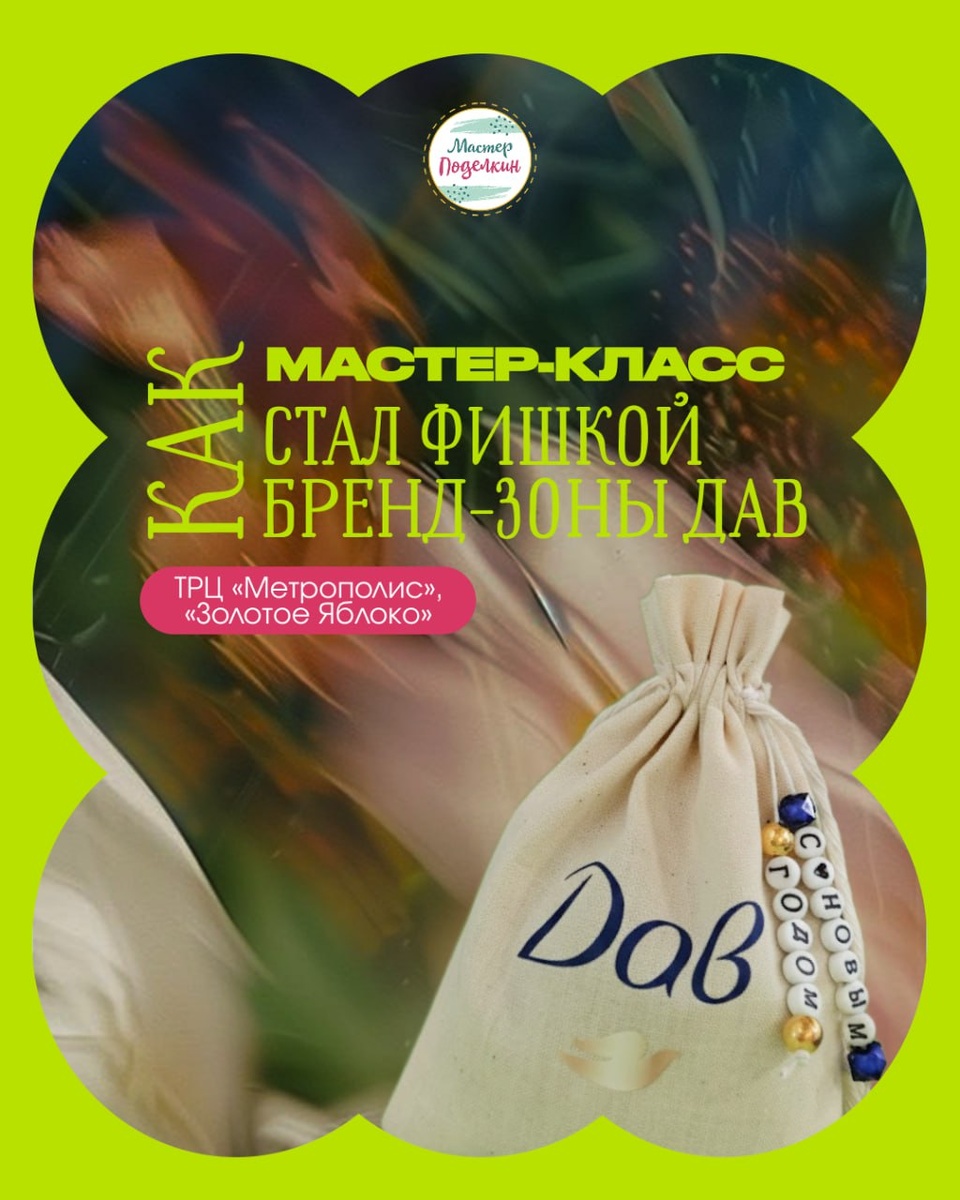 ! В ТРЦ Метрополис мы создали не просто точку продаж, а творческую лабораторию по созданию настроения. Гости, купившие два продукта Дав в «Золотом Яблоке», получали возможность создать своё уникальное аромасаше. Шелест сушеных трав, выбор любимого аромата, тактильность холщового мешочка... Кто-то собирал композицию для сладких снов, а кто-то — для концентрации на работе. Почему это гениально для бренда? 💜Глубокая связь: Забота Дав вышла за пределы ванной и поселилась в шкафу, на столе, в сумке. 💜Яркий опыт: Вместо одноразового подарка — памятный ритуал, о котором рассказывают друзьям. 💜Драйв продаж: Простая механика «2 товара = мастер-класс» мотивировала к покупке именно здесь и сейчас. Современному покупателю нужны не только продукты, но и эмоции ❤️ Студия «Мастер Поделкин» — мы создаем такие форматы, где бренд и клиент встречаются не у полки, а в моменте радости и творчества. Давайте творить вместе: @masterpodelkin