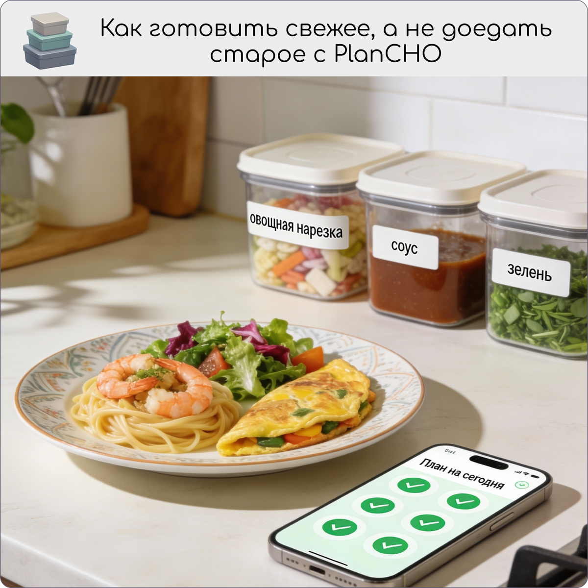 Новогодние каникулы — это не только ёлка, мандарины и праздник. Это ещё и гора холодца, надоевшего оливье и салата «Мимоза», которую предстоит доедать всей семьёй до следующих выходных. Знакомо? А что, если после 1 января на столе каждый день будет появляться что-то свежее, ароматное и приготовленное за 15-20 минут? Без многочасового стояния у плиты после тяжёлой ночи. Звучит как сказка, но это реально. Всё дело в планировании и smart-заготовках. Вот простой алгоритм, как это работает: 1. Планируем меню на неделю вперёд. Не в уме, а в удобном сервисе PlanCHO. Туда заносите все блюда, которые хотите готовить. 2. Учитываем всех. Муж на диете? Ребёнок не ест лук? Программа сразу подсветит, в каких блюдах есть «запрещёнка». Можно даже считать калории и БЖУ для худеющих или спортсменов. 3. Делаем умные заготовки на выходных. Программа не просто даст список продуктов, а рассчитает, что и в какой день готовить. Не нужно чистить картошку пять раз за неделю. Почистили один раз, разложили по пак