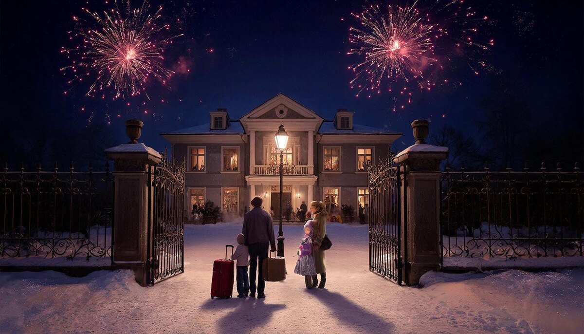 Снег падал медленно, пушистыми хлопьями, будто кто-то наверху сыпал его не спеша, лениво, как сахарную пудру на приторный пирог — особняк за коваными воротами. Дом сиял золотом гирлянд, мягкие лучи вырисовывали каждое витражное окно, а внутри, за длинными шторами, тени танцевали под музыку. Там пахло шампанским, канапе и успешной жизнью.