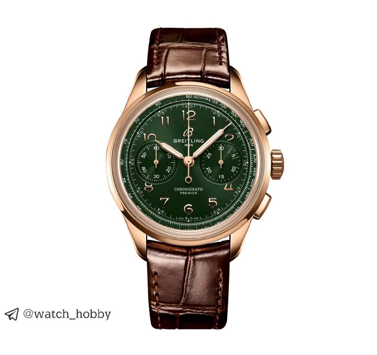 🎄 Розовое золото, зеленый циферблат и красивый калибр с ручным подзаводом - формула новинки. Что с характеристиками: - Корпус из золота - Ремешок из кожи - Зеленый матовый циферблат - Размер корпуса: 40 мм - От ушка до ушка: 47.65 мм - Высота корпуса: 13.08 мм - Вес: 131 грамм - Сатиновая и зеркальная полировка - Сапфировое стекло - Водозащита 100 метров - Дата - Хронограф - Малая секундна стрелка - Механический калибр Breitling B09 с запасом хода в 70 часов Элегантный и мастерски исполненный хронограф от Breitling окрасился в зеленый цвет. Модели Premier, пожалуй, одни из самых красивых часов компании. Хотя по большому счету, конечно же, это для всех по-разному. Корпус, прямоугольные кнопки, заводная головка, застежка на ремешке, цифры и стрелки - все из золота. Как и черный цвет, зеленый всегда хорошо дополняет розовое золото. На матовом циферблате расположились накладные арабские цифры и 5 аккуратных стрелок. Красоту механизма можно рассмотреть сквозь заднюю прозрачную крышку.