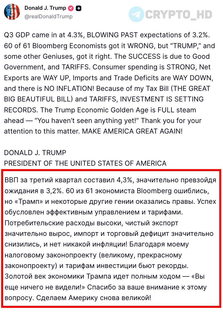 ВВП США в третьем квартале вырос до 4,3%, превзойдя прогнозы экономистов. Президент приписал этот успех своей политике тарифов и налоговой реформе, отметив рост потребительских расходов и экспорта при снижении импорта. Дональд Трамп также подчеркнул отсутствие инфляции (❗️) и рекордные показатели инвестиций, назвав происходящее «золотой экономической эрой» (original) Crypto Headlines
