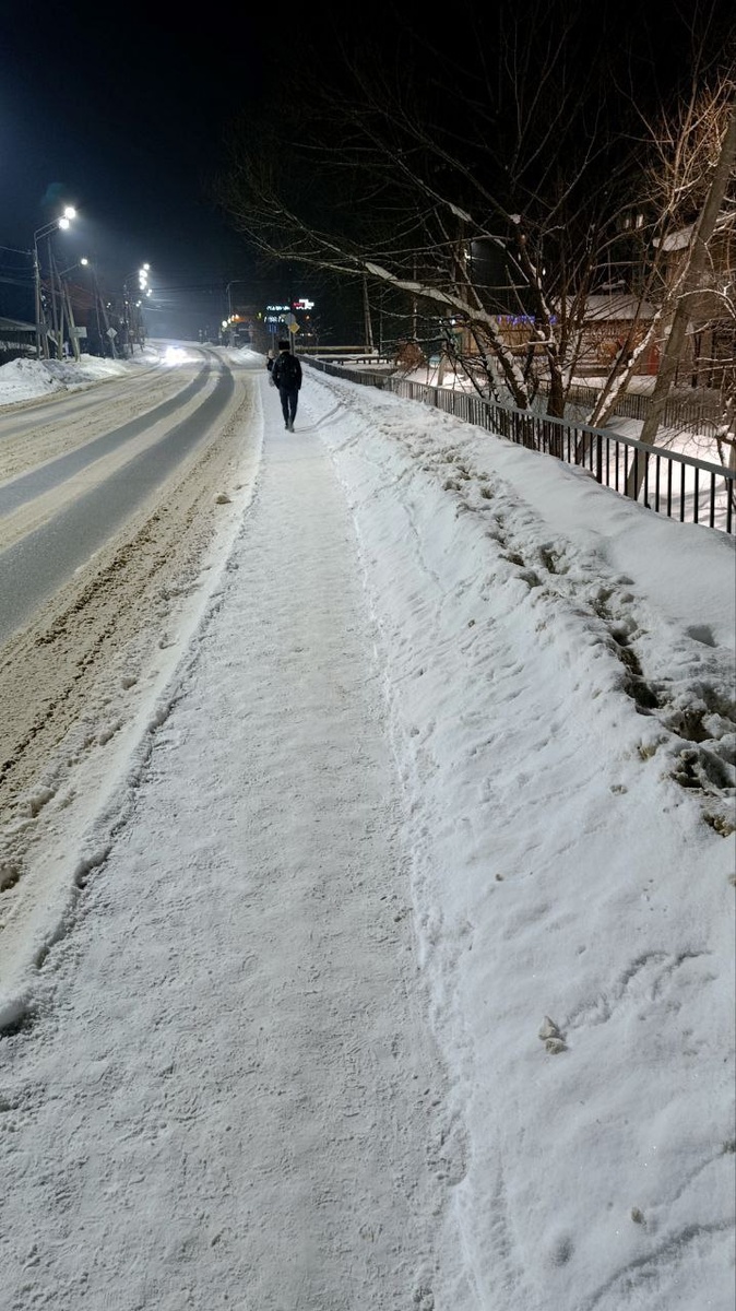 Напротив Рима тротуар стал очень узким из-за того, что снег сдвигают в сторону. Людям приходится обходить друг друга по проезжей части.