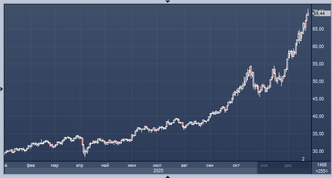 Драгоценные металлы достигли рекордного максимума. Золото стоит 4497,55 доллара, подорожав более чем на 70% в этом году. Серебро достигло нового максимума в 70,61 доллара, опередив золото с ростом на 143% с начала года. Платина достигла 17-летнего пика, палладий — трехлетнего максимума График цен на серебро с немедленной поставкой интервалами в 1 день Серебро во вторник впервые поднялось выше 70 долларов за унцию, достигнув рекордного уровня. Золото, в свою очередь, также показало значительный рост, торгуясь чуть ниже 4500 долларов за унцию. Ослабление доллара и сохраняющаяся геополитическая нестабильность стимулируют спрос на защитные активы. Стоимость серебра увеличилась на 2,2%, достигнув 70,61 доллара за унцию, что стало новым историческим максимумом. С начала года этот металл подорожал на 143%. Основной причиной роста стали ограниченное предложение, увеличение промышленного спроса и приток инвестиций. Ахмад Ассири, аналитик из Pepperstone, отметил, что серебро реагирует на макроэк