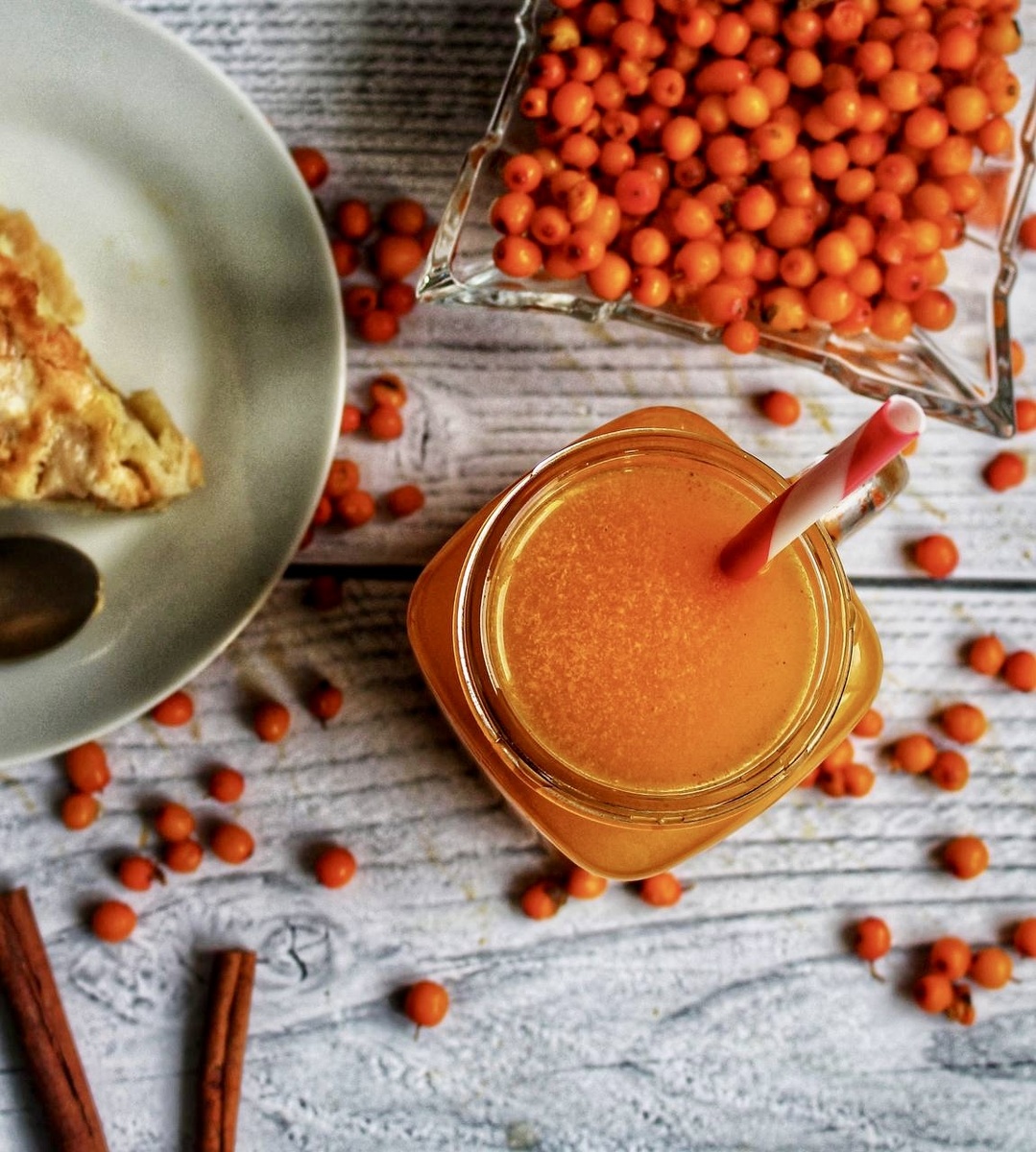 Ингредиенты: ▫️облепиха замороженная — 300 г ▫️вода — 2 л ▫️имбирь молотый — ½ ч. л. ▫️куркума — ½ ч. л. ▫️сахар — 200 г ▫️мед — 2 ст. л. ▫️корица — 1 шт. Способ приготовления: 1. Ягоды заранее разморозить, перебрать и промыть. Подготовить все ингредиенты. 2. Ягоды растолочь в ступке, сцедить сок при помощи мелкого сита или марли. Полученный сок убрать в холодильник. 3. Добавить в образовавшийся жмых имбирь и куркуму, тщательно перемешать. 4. Залить жмых со специями двумя литрами холодной воды, добавить сахар и палочку корицы. Довести до кипения, снять с огня и дать настояться в течение 20 минут под крышкой. 5. Через 20 минут процедить через марлю или мелкое сито. 6. Добавить облепиховый сок из холодильника и мед, тщательно перемешать. 7. Разлить по кружкам, по желанию украсить палочками корицы, подавать горячим или теплым. Приятного аппетита!