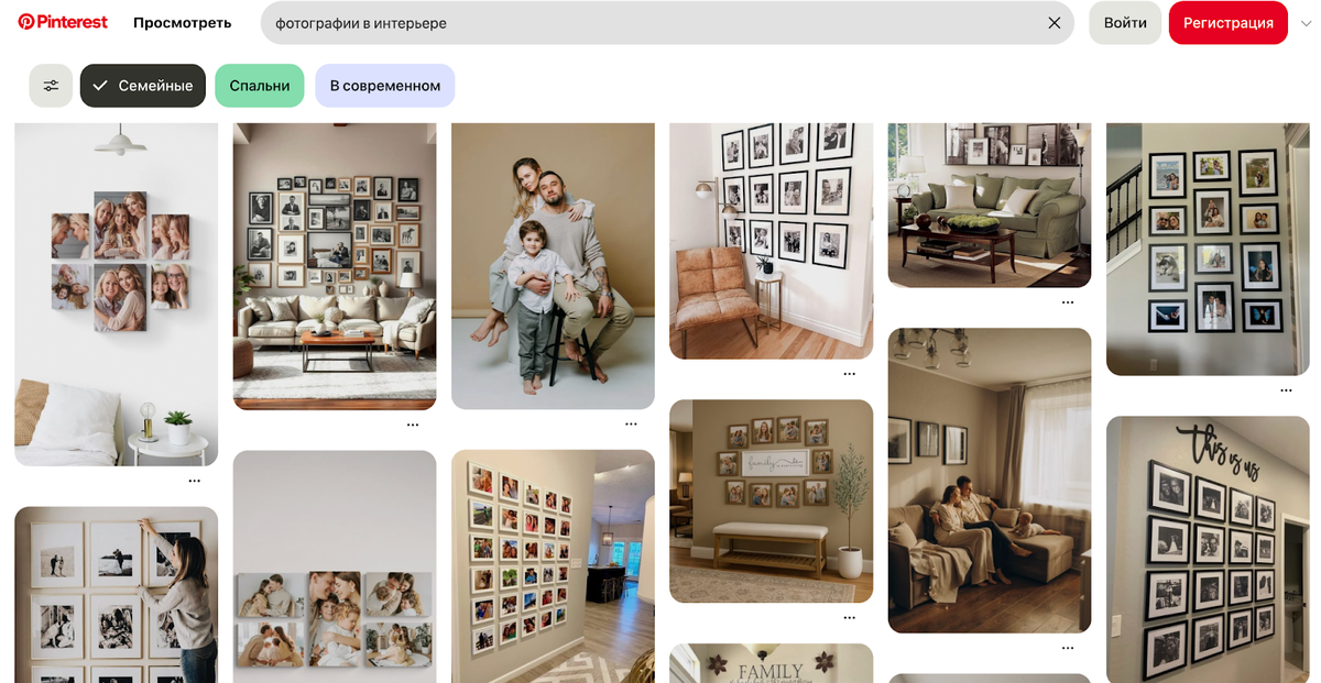 Полистайте тот же Pinterest — обратите внимание, как вписаны фотогалереи в интерьер. Где-то это основа оформления комнаты, а где-то — милый акцент, который не привлекает излишнего внимания, но дополняет общую композицию.