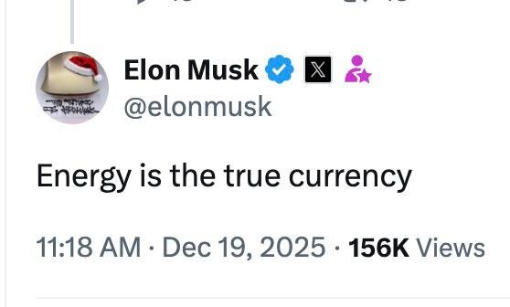 » Илон Маск написал короткую фразу, но она зацепила меня сильнее большинства аналитических отчётов: Energy is the true currency. Почему он вообще так формулирует? Если отбросить хайп, это не про биткоин напрямую. Это про более глубокий слой реальности. Деньги — это не бумага. Не цифры на счёте. И даже не доверие, как принято говорить. Деньги — это способ учитывать и передавать затраченный человеческий и физический ресурс. А в основе любого ресурса всегда лежит энергия. Любой товар — это энергия, приведённая в форму. Любая услуга — это энергия времени и внимания. Любая экономика — это система перераспределения энергии. И здесь появляется биткоин. Биткоин — первый в истории актив, где: — выпуск напрямую привязан к затраченной энергии, — эмиссию нельзя ускорить решением совета директоров, — правила одинаковы для всех участников системы. Это не «обеспечен энергией» в примитивном смысле. Это энергия, зафиксированная в цифровом виде, с жёсткими правилами учёта. Фиат — это обещание